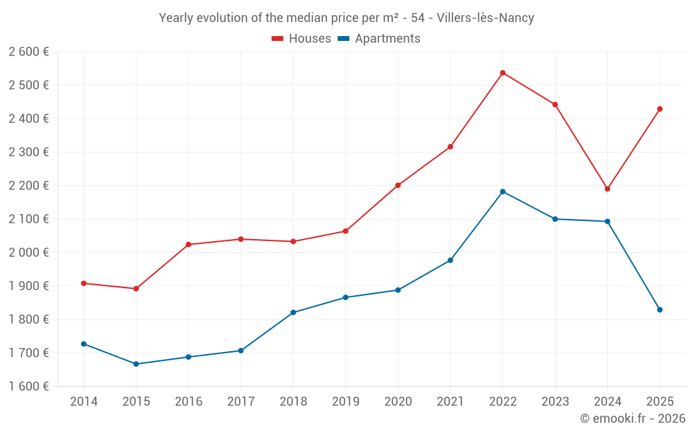 The median price on the 28 house transactions of the last 6 months in the municipality of Villers-lès-Nancy was 2 429 € per square meter for a median property value of 255 000 €. Over this period, 60% of transactions were between 2 015 and 3 171 € per square meter (from the 2nd to the 8th deciles).