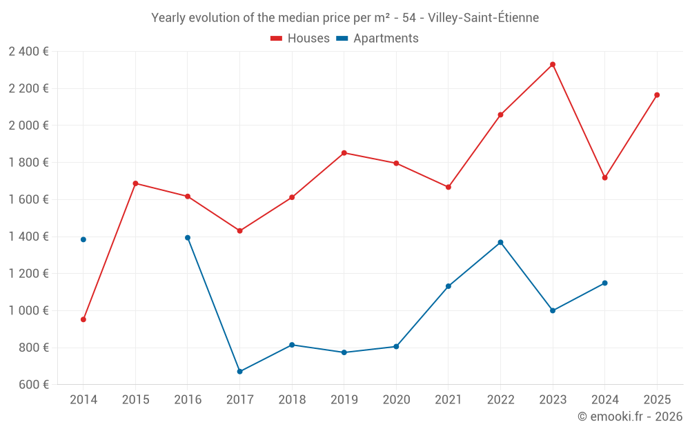 The median price on the 15 house transactions of the last 24 months in the municipality of Villey-Saint-Étienne was 1 819 € per square meter for a median property value of 240 000 €. Over this period, 60% of transactions were between 1 509 and 2 428 € per square meter (from the 2nd to the 8th deciles).