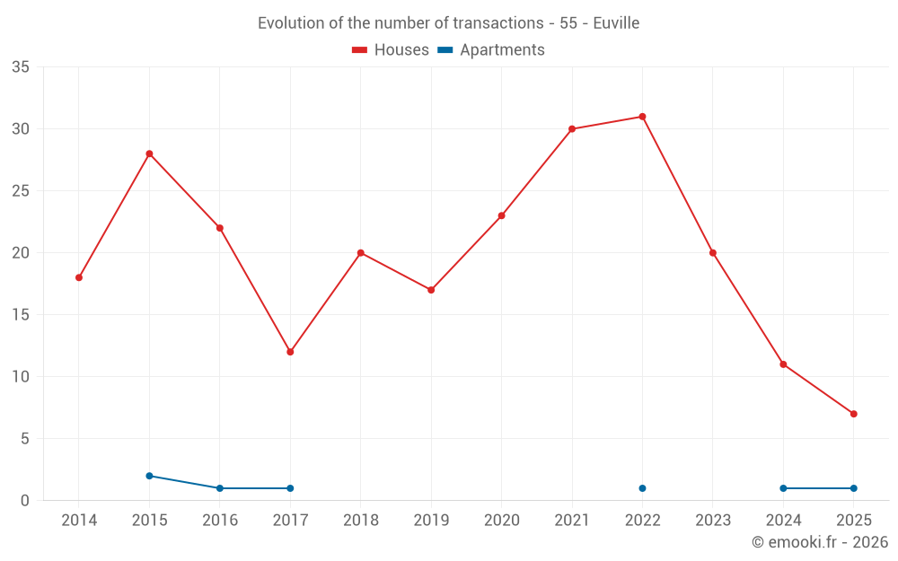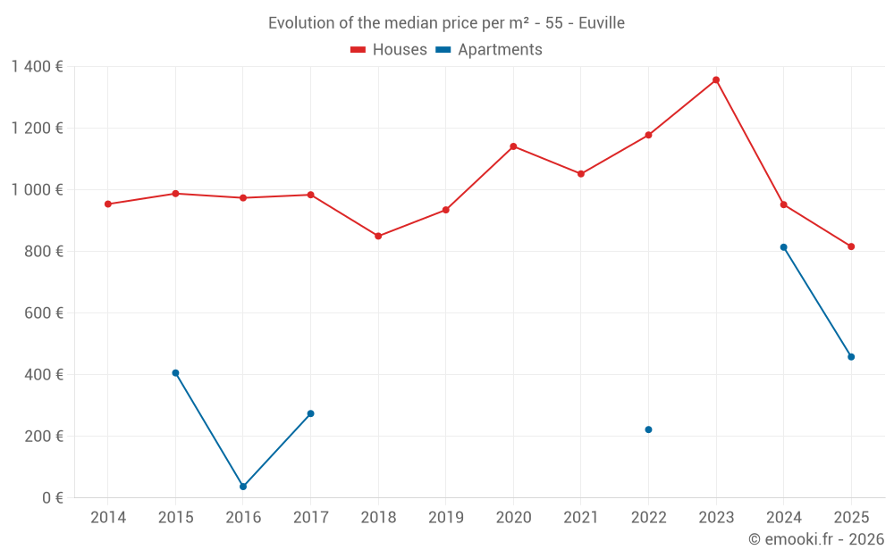 The median price on the 27 house transactions of the last 24 months in the municipality of Euville was 895 € per square meter for a median property value of 134 860 €. Over this period, 60% of transactions were between 703 and 1 657 € per square meter (from the 2nd to the 8th deciles).