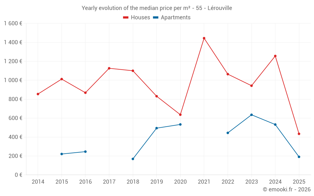 The median price on the 24 house transactions of the last 24 months in the municipality of Lérouville was 1 026 € per square meter for a median property value of 108 200 €. Over this period, 60% of transactions were between 551 and 1 438 € per square meter (from the 2nd to the 8th deciles).