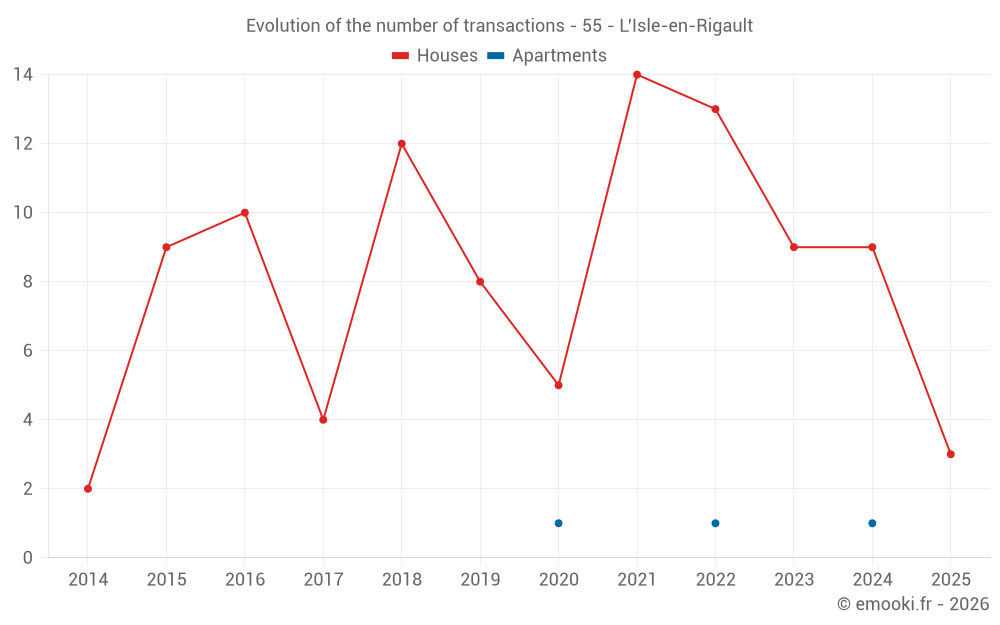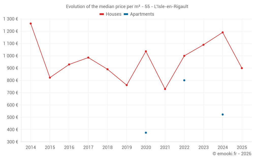 The median price on the 15 house transactions of the last 24 months in the municipality of L'Isle-en-Rigault was 1 105 € per square meter for a median property value of 90 000 €. Over this period, 60% of transactions were between 662 and 1 315 € per square meter (from the 2nd to the 8th deciles).