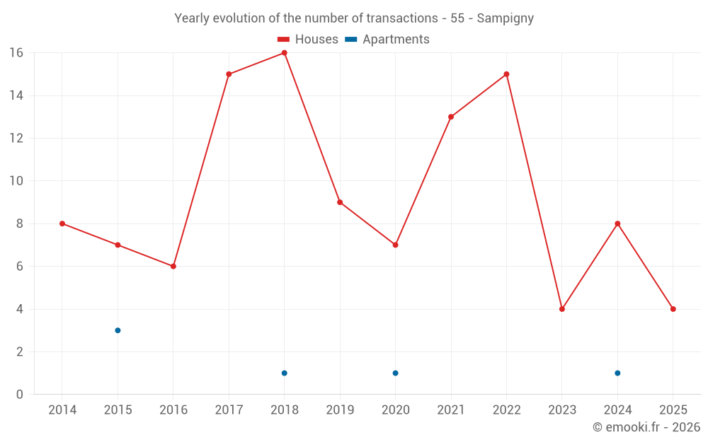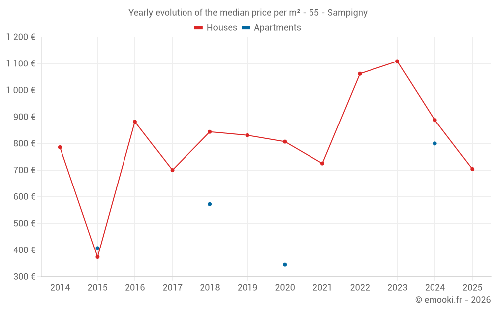 The median price on the 15 house transactions of the last 24 months in the municipality of Sampigny was 842 € per square meter for a median property value of 106 000 €. Over this period, 60% of transactions were between 411 and 1 191 € per square meter (from the 2nd to the 8th deciles).