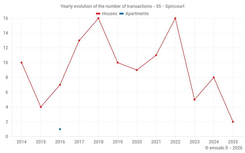 The median price on the 14 house transactions of the last 24 months in the municipality of Spincourt was 801 € per square meter for a median property value of 122 500 €. Over this period, 60% of transactions were between 588 and 1 754 € per square meter (from the 2nd to the 8th deciles).