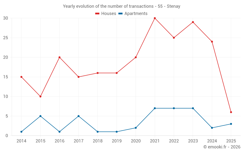 The median price on the 18 house transactions of the last 12 months in the municipality of Stenay was 686 € per square meter for a median property value of 67 000 €. Over this period, 60% of transactions were between 198 and 1 180 € per square meter (from the 2nd to the 8th deciles).