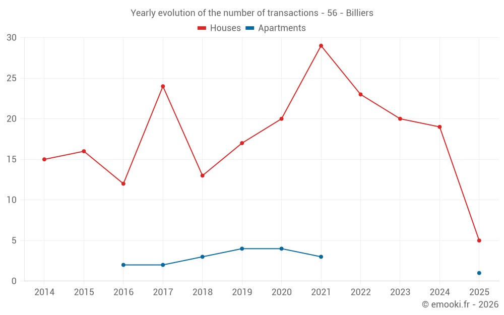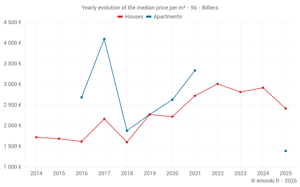 The median price on the 35 house transactions of the last 24 months in the municipality of Billiers was 2 816 € per square meter for a median property value of 283 465 €. Over this period, 60% of transactions were between 2 093 and 3 585 € per square meter (from the 2nd to the 8th deciles).
