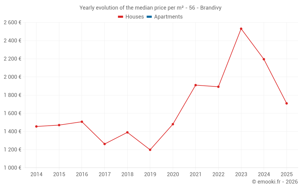The median price on the 27 house transactions of the last 24 months in the municipality of Brandivy was 2 195 € per square meter for a median property value of 245 000 €. Over this period, 60% of transactions were between 1 763 and 2 914 € per square meter (from the 2nd to the 8th deciles).