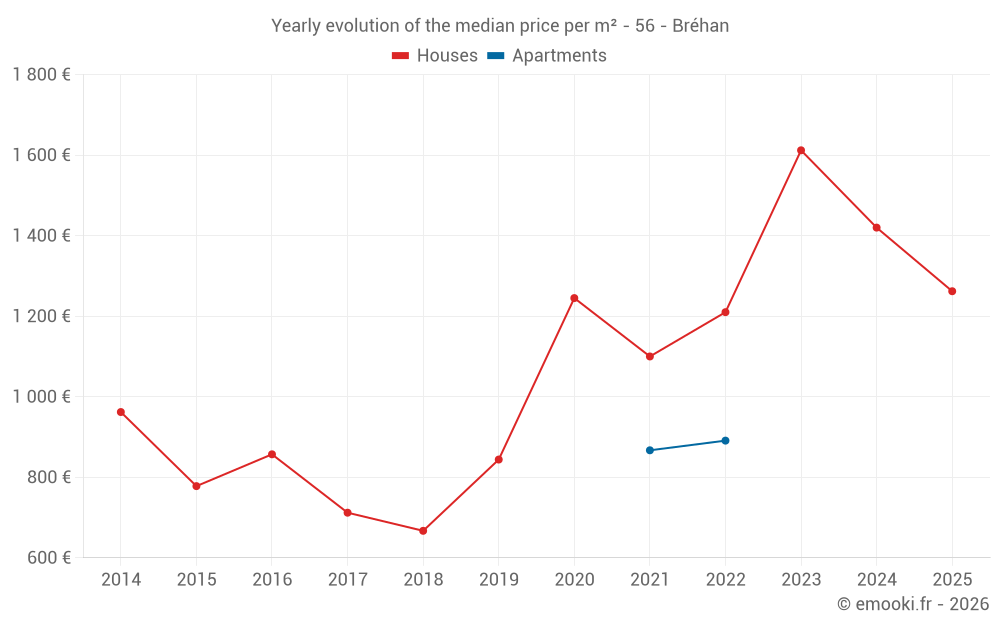 The median price on the 23 house transactions of the last 12 months in the municipality of Bréhan was 1 356 € per square meter for a median property value of 128 800 €. Over this period, 60% of transactions were between 862 and 1 908 € per square meter (from the 2nd to the 8th deciles).