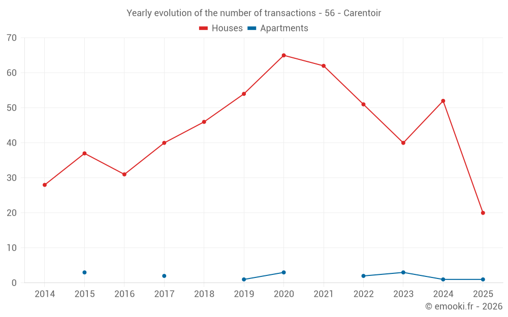 The median price on the 20 house transactions of the last 6 months in the municipality of Carentoir was 1 174 € per square meter for a median property value of 112 000 €. Over this period, 60% of transactions were between 746 and 1 838 € per square meter (from the 2nd to the 8th deciles).
