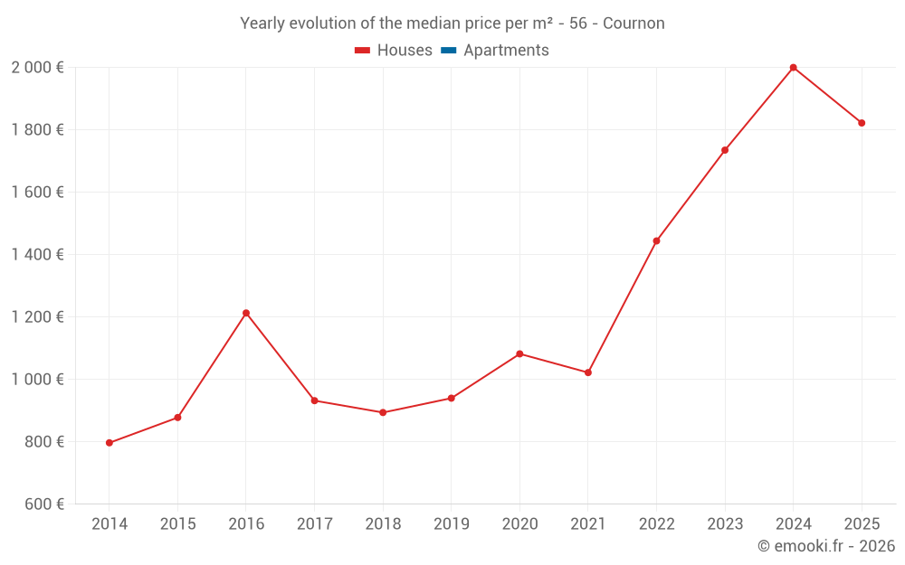 The median price on the 18 house transactions of the last 12 months in the municipality of Cournon was 2 000 € per square meter for a median property value of 160 162 €. Over this period, 60% of transactions were between 1 156 and 2 164 € per square meter (from the 2nd to the 8th deciles).