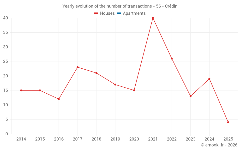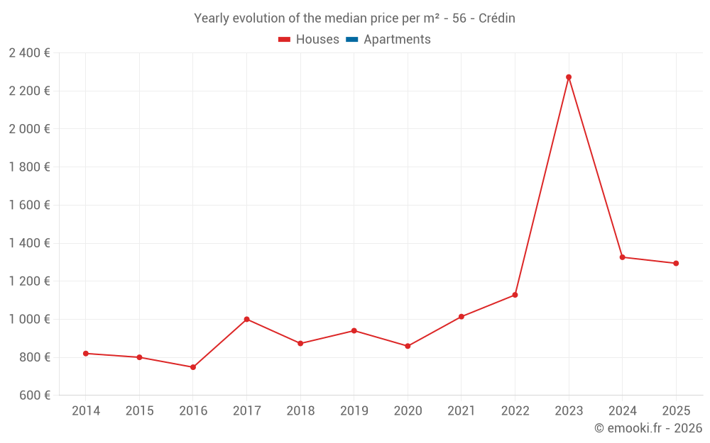 The median price on the 17 house transactions of the last 12 months in the municipality of Crédin was 1 371 € per square meter for a median property value of 122 010 €. Over this period, 60% of transactions were between 922 and 1 804 € per square meter (from the 2nd to the 8th deciles).