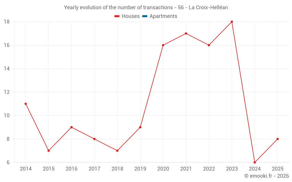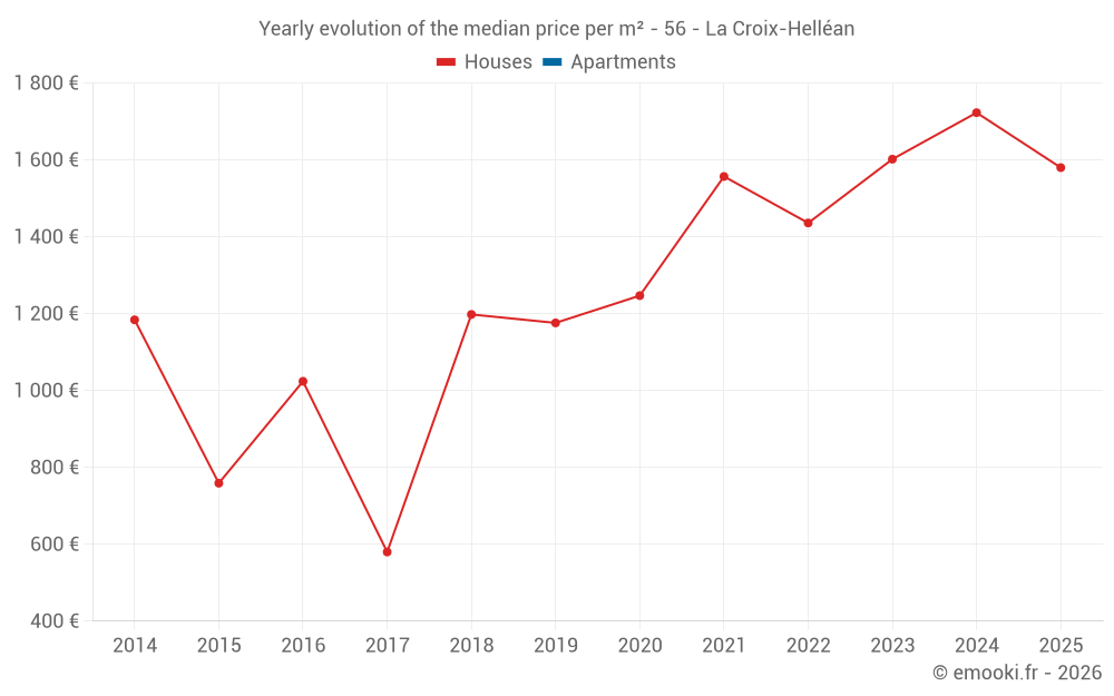 The median price on the 25 house transactions of the last 24 months in the municipality of La Croix-Helléan was 1 615 € per square meter for a median property value of 170 000 €. Over this period, 60% of transactions were between 1 202 and 2 257 € per square meter (from the 2nd to the 8th deciles).