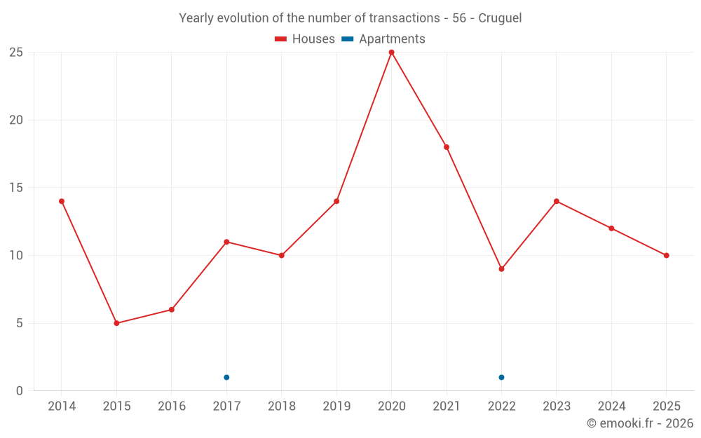 The median price on the 22 house transactions of the last 24 months in the municipality of Cruguel was 1 303 € per square meter for a median property value of 110 000 €. Over this period, 60% of transactions were between 927 and 1 746 € per square meter (from the 2nd to the 8th deciles).