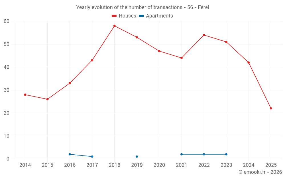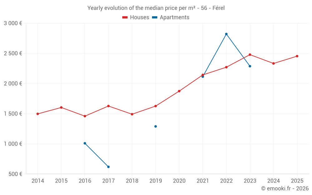 The median price on the 22 house transactions of the last 6 months in the municipality of Férel was 2 455 € per square meter for a median property value of 192 500 €. Over this period, 60% of transactions were between 1 432 and 2 997 € per square meter (from the 2nd to the 8th deciles).