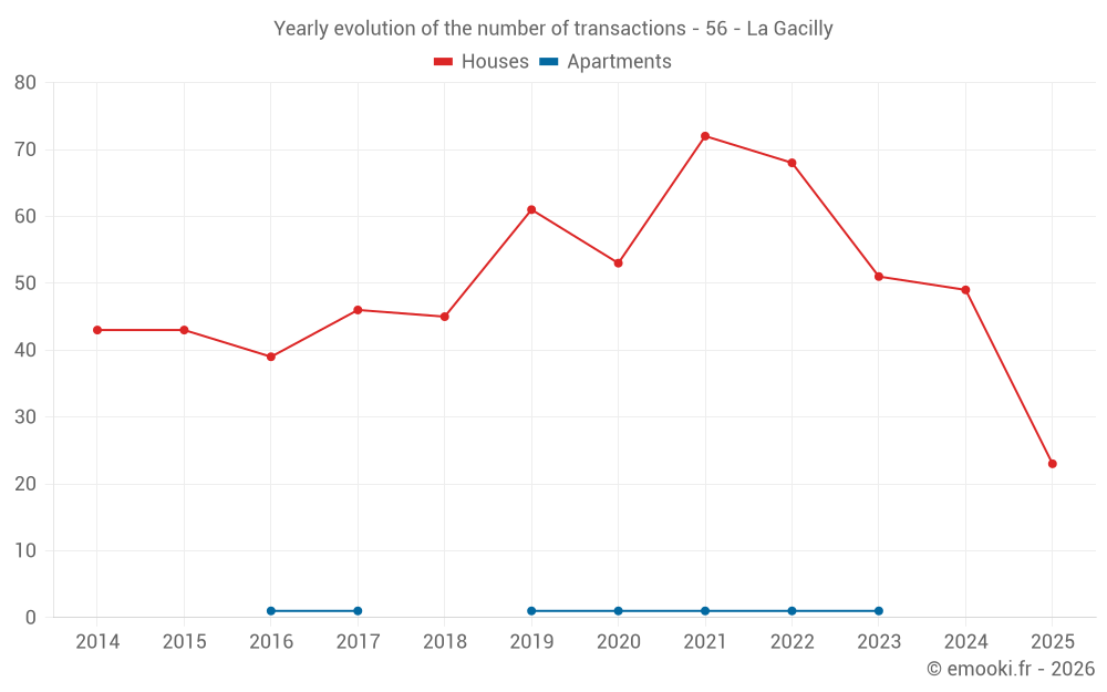 The median price on the 23 house transactions of the last 6 months in the municipality of La Gacilly was 1 720 € per square meter for a median property value of 145 000 €. Over this period, 60% of transactions were between 1 154 and 2 130 € per square meter (from the 2nd to the 8th deciles).
