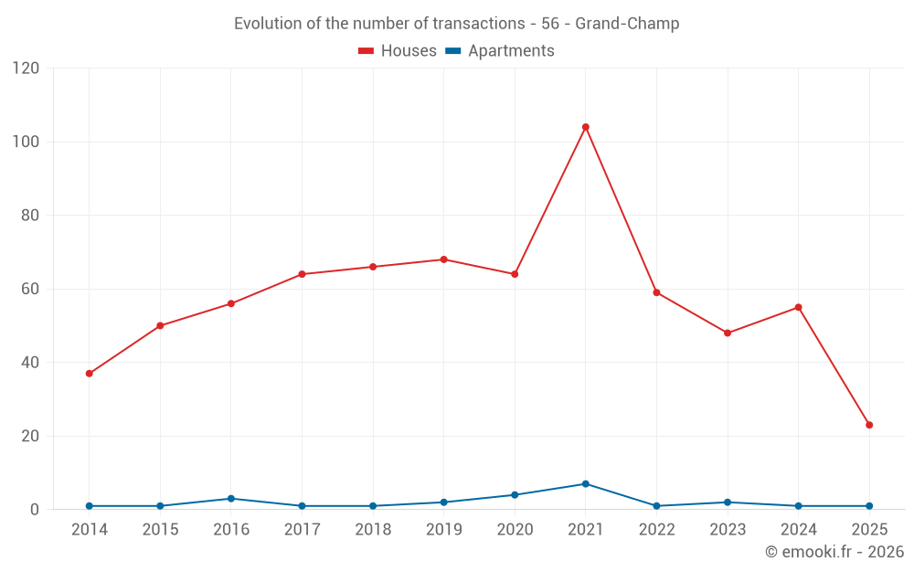 The median price on the 23 house transactions of the last 6 months in the municipality of Grand-Champ was 2 159 € per square meter for a median property value of 211 200 €. Over this period, 60% of transactions were between 1 638 and 3 202 € per square meter (from the 2nd to the 8th deciles).