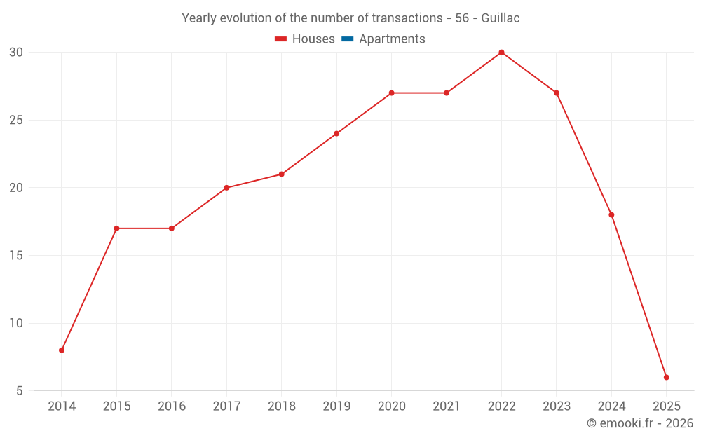 The median price on the 45 house transactions of the last 24 months in the municipality of Guillac was 1 757 € per square meter for a median property value of 161 000 €. Over this period, 60% of transactions were between 1 176 and 2 449 € per square meter (from the 2nd to the 8th deciles).