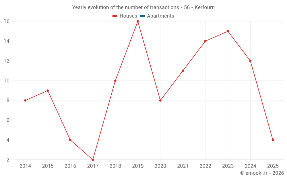 The median price on the 28 house transactions of the last 24 months in the municipality of Kerfourn was 1 518 € per square meter for a median property value of 151 500 €. Over this period, 60% of transactions were between 875 and 2 104 € per square meter (from the 2nd to the 8th deciles).