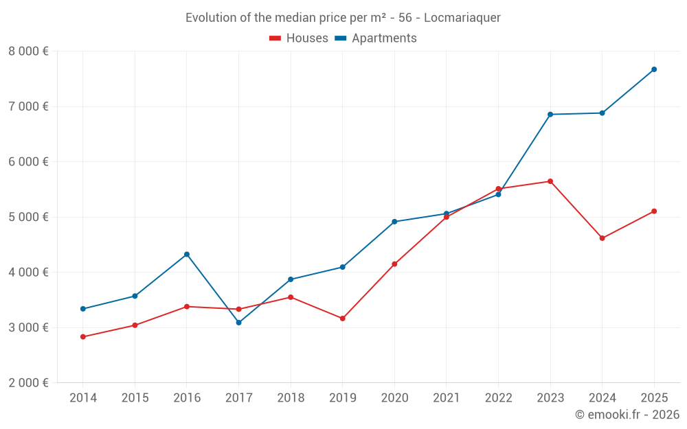 The median price on the 28 house transactions of the last 12 months in the municipality of Locmariaquer was 5 112 € per square meter for a median property value of 455 000 €. Over this period, 60% of transactions were between 4 370 and 6 480 € per square meter (from the 2nd to the 8th deciles).