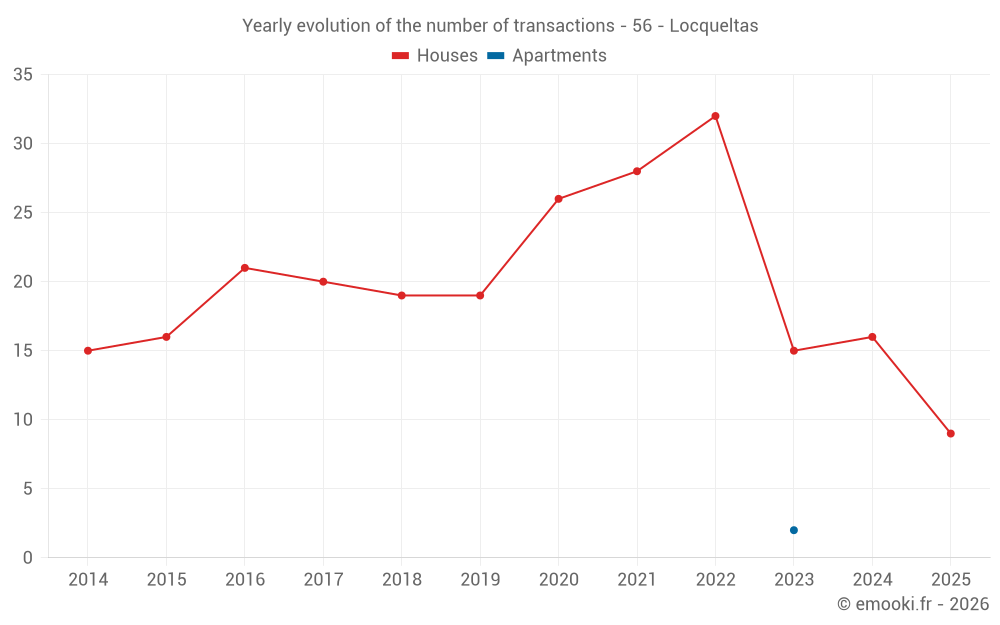 The median price on the 16 house transactions of the last 12 months in the municipality of Locqueltas was 2 500 € per square meter for a median property value of 269 250 €. Over this period, 60% of transactions were between 1 870 and 2 992 € per square meter (from the 2nd to the 8th deciles).