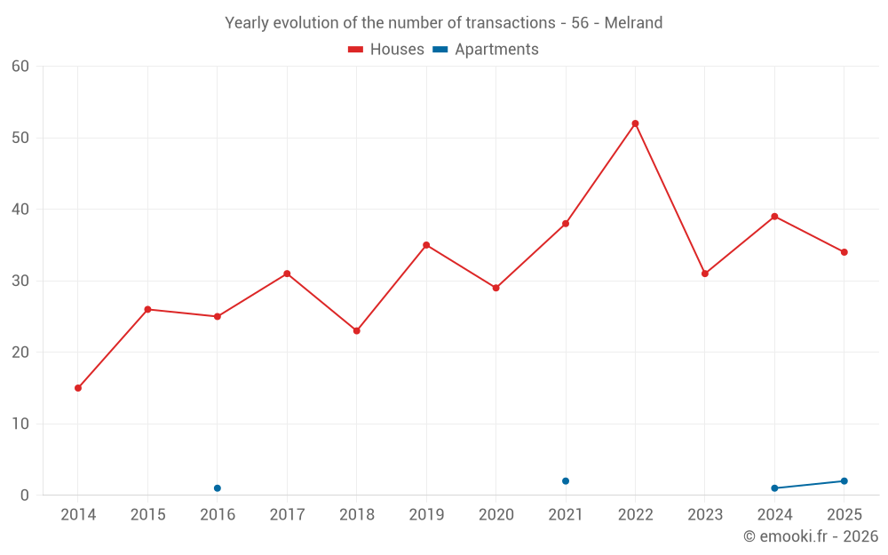 The median price on the 34 house transactions of the last 12 months in the municipality of Melrand was 1 271 € per square meter for a median property value of 122 000 €. Over this period, 60% of transactions were between 625 and 2 000 € per square meter (from the 2nd to the 8th deciles).