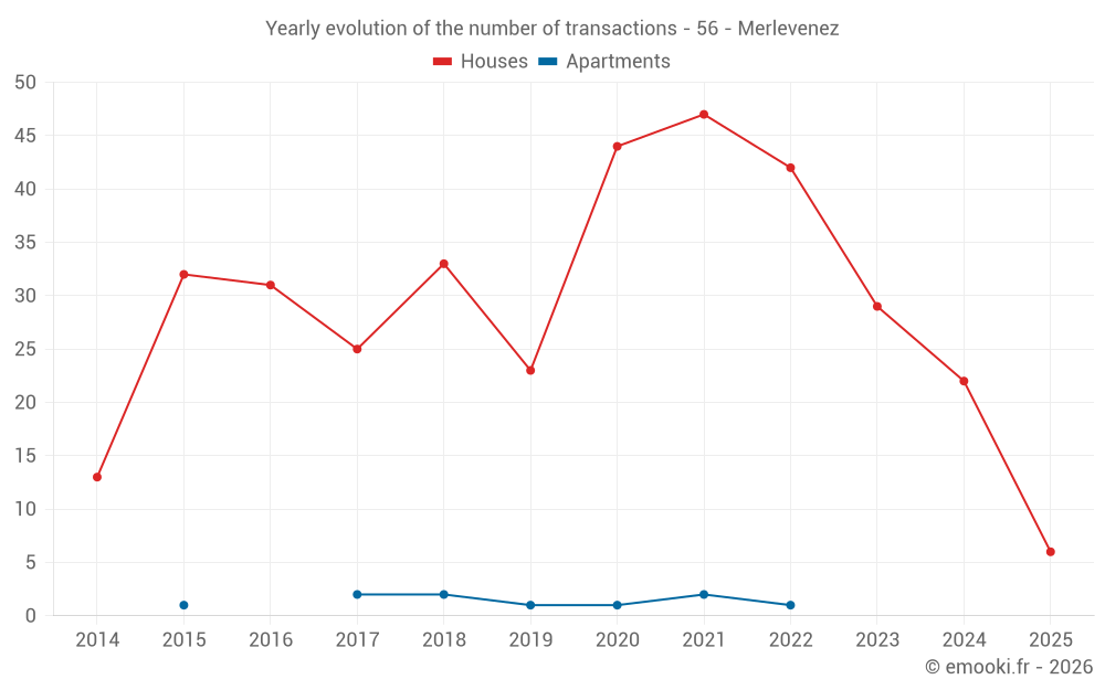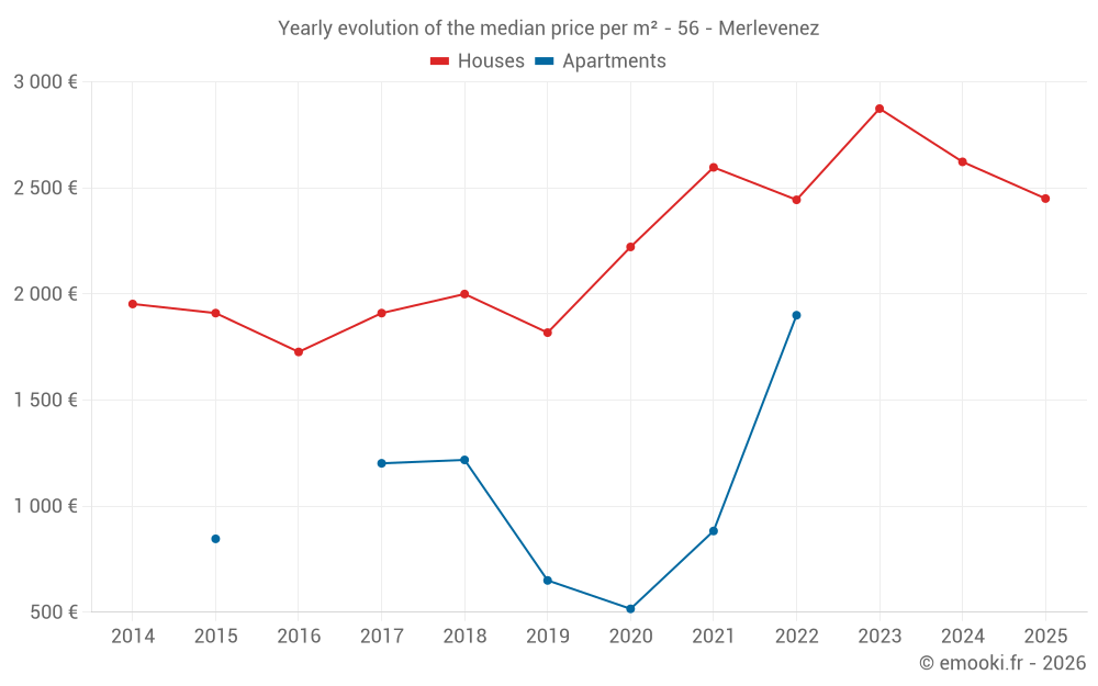 The median price on the 23 house transactions of the last 12 months in the municipality of Merlevenez was 2 778 € per square meter for a median property value of 295 000 €. Over this period, 60% of transactions were between 2 216 and 3 323 € per square meter (from the 2nd to the 8th deciles).