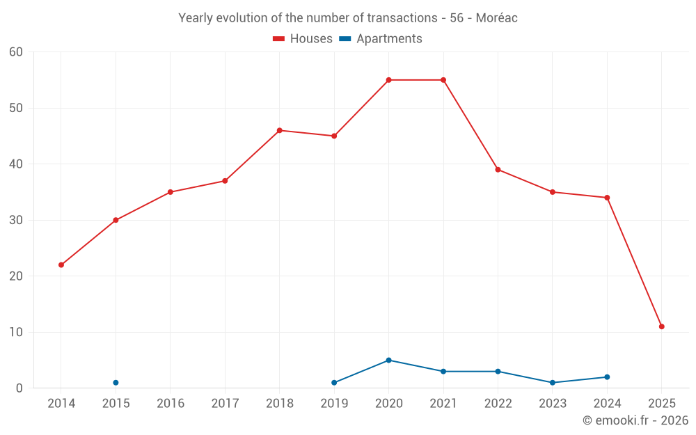 The median price on the 34 house transactions of the last 12 months in the municipality of Moréac was 1 795 € per square meter for a median property value of 169 000 €. Over this period, 60% of transactions were between 1 239 and 2 085 € per square meter (from the 2nd to the 8th deciles).