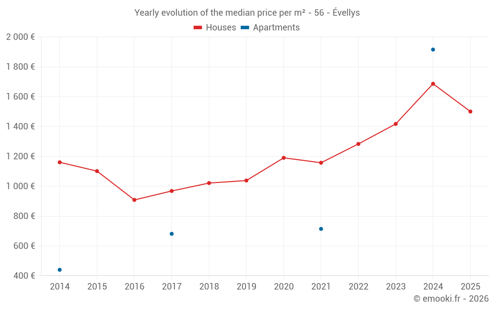 The median price on the 23 house transactions of the last 6 months in the municipality of Évellys was 1 500 € per square meter for a median property value of 130 000 €. Over this period, 60% of transactions were between 1 040 and 1 872 € per square meter (from the 2nd to the 8th deciles).