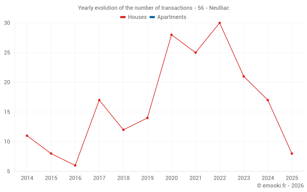 The median price on the 18 house transactions of the last 12 months in the municipality of Neulliac was 1 942 € per square meter for a median property value of 194 162 €. Over this period, 60% of transactions were between 1 216 and 2 237 € per square meter (from the 2nd to the 8th deciles).