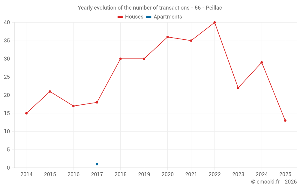The median price on the 29 house transactions of the last 12 months in the municipality of Peillac was 1 725 € per square meter for a median property value of 147 000 €. Over this period, 60% of transactions were between 1 299 and 1 998 € per square meter (from the 2nd to the 8th deciles).