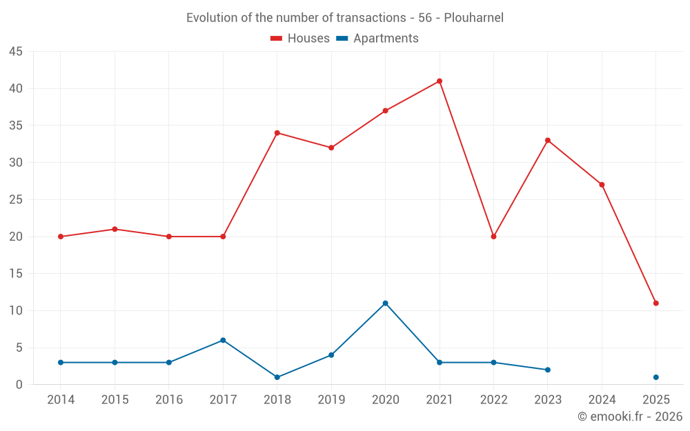 The median price on the 24 house transactions of the last 12 months in the municipality of Plouharnel was 3 928 € per square meter for a median property value of 370 500 €. Over this period, 60% of transactions were between 2 776 and 6 117 € per square meter (from the 2nd to the 8th deciles).