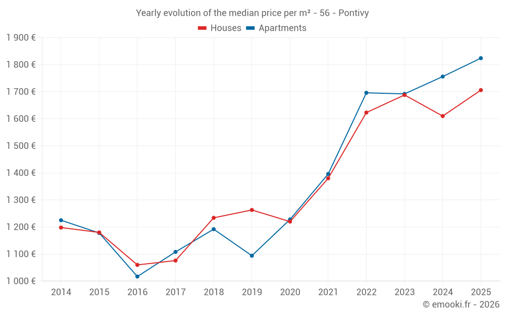 The median price on the 23 apartment transactions of the last 3 months in the municipality of Pontivy was 1 885 € per square meter for a median property value of 115 000 €. Over this period, 60% of transactions were between 1 339 and 2 131 € per square meter (from the 2nd to the 8th deciles).