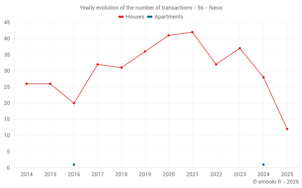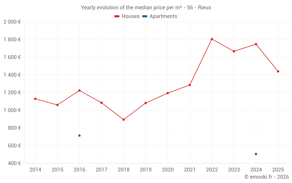 The median price on the 29 house transactions of the last 12 months in the municipality of Rieux was 1 699 € per square meter for a median property value of 150 000 €. Over this period, 60% of transactions were between 1 171 and 2 122 € per square meter (from the 2nd to the 8th deciles).