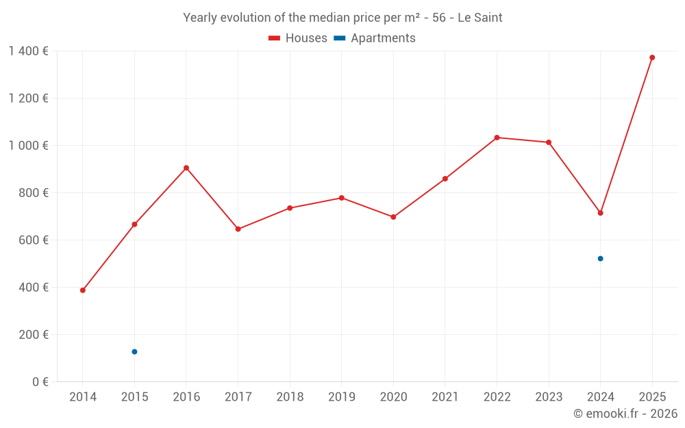 The median price on the 19 house transactions of the last 12 months in the municipality of Le Saint was 1 167 € per square meter for a median property value of 70 000 €. Over this period, 60% of transactions were between 311 and 1 843 € per square meter (from the 2nd to the 8th deciles).