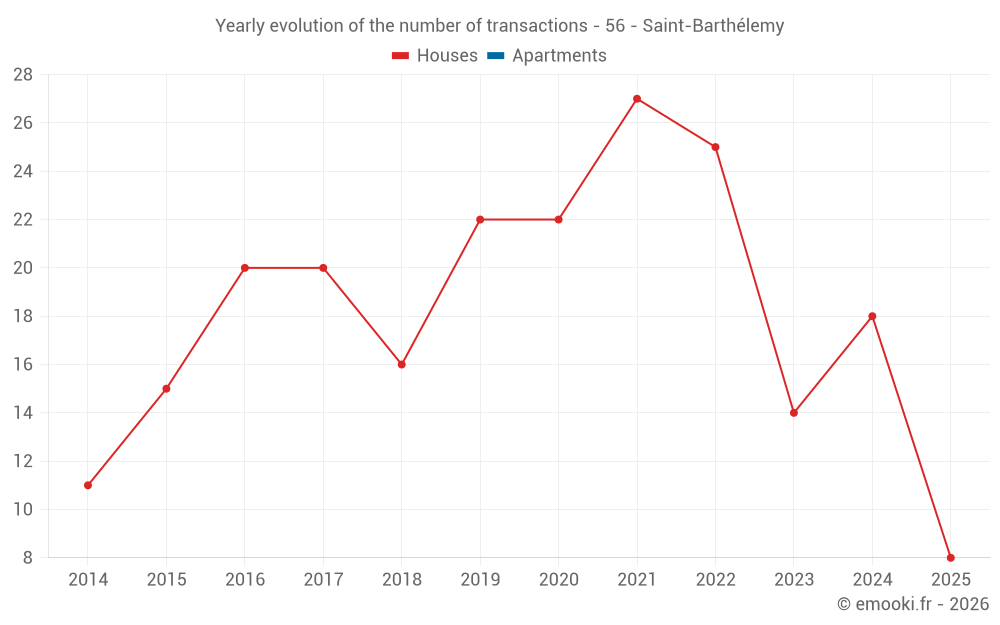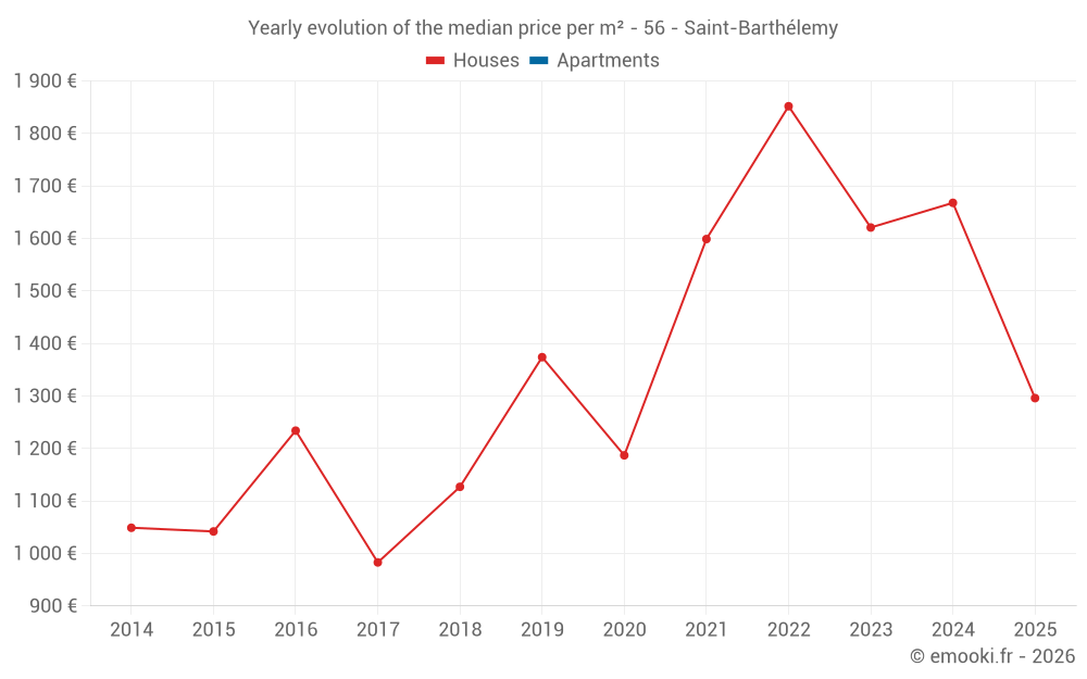 The median price on the 19 house transactions of the last 12 months in the municipality of Saint-Barthélemy was 1 444 € per square meter for a median property value of 190 000 €. Over this period, 60% of transactions were between 1 123 and 2 184 € per square meter (from the 2nd to the 8th deciles).