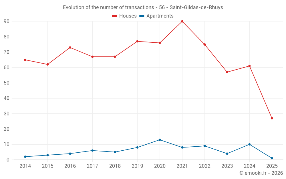 The median price on the 27 house transactions of the last 6 months in the municipality of Saint-Gildas-de-Rhuys was 4 590 € per square meter for a median property value of 450 000 €. Over this period, 60% of transactions were between 3 424 and 5 402 € per square meter (from the 2nd to the 8th deciles).