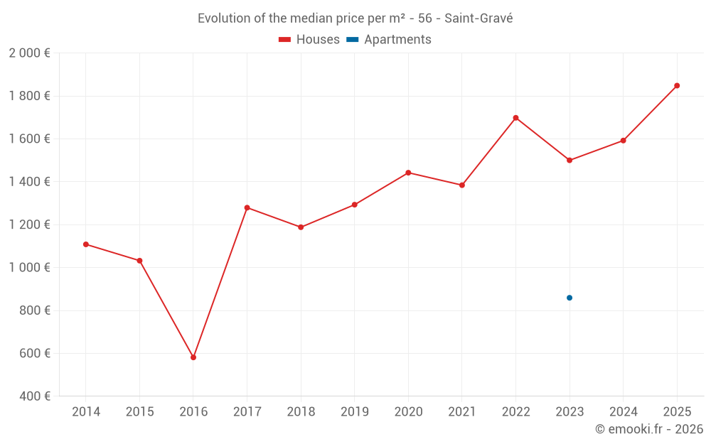 The median price on the 16 house transactions of the last 12 months in the municipality of Saint-Gravé was 1 788 € per square meter for a median property value of 150 000 €. Over this period, 60% of transactions were between 1 400 and 2 089 € per square meter (from the 2nd to the 8th deciles).