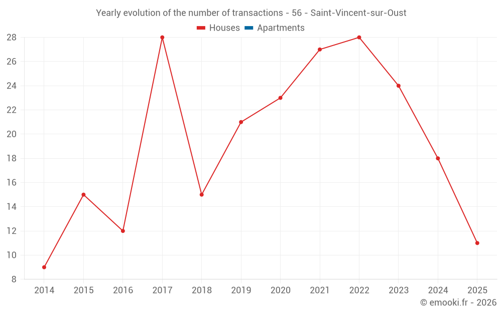 The median price on the 17 house transactions of the last 12 months in the municipality of Saint-Vincent-sur-Oust was 1 579 € per square meter for a median property value of 130 000 €. Over this period, 60% of transactions were between 904 and 2 280 € per square meter (from the 2nd to the 8th deciles).
