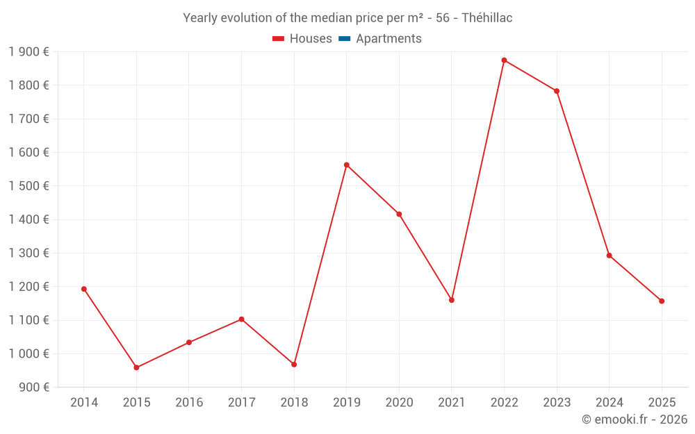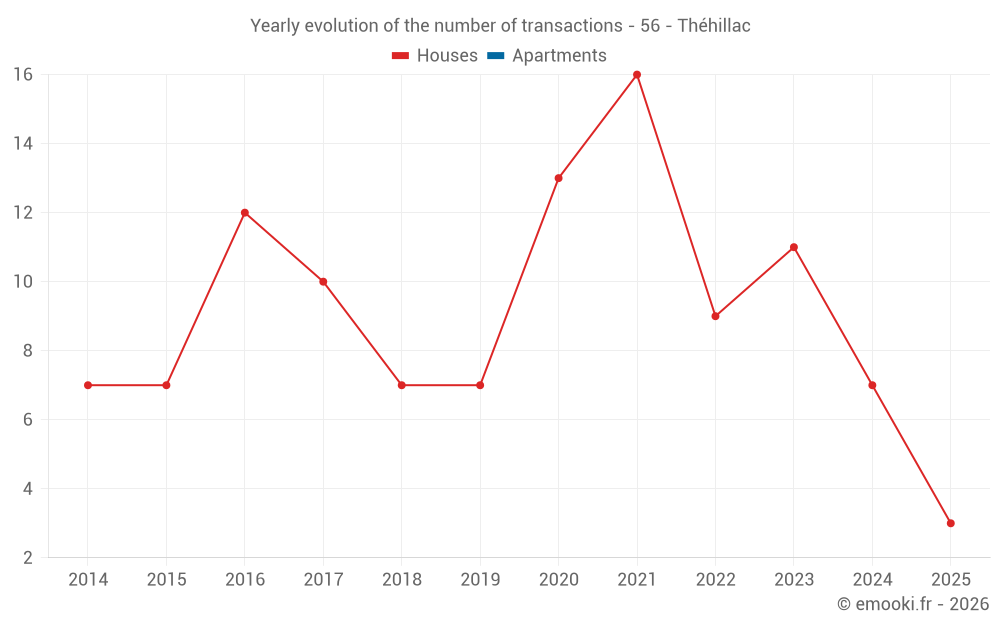 The median price on the 16 house transactions of the last 24 months in the municipality of Théhillac was 1 501 € per square meter for a median property value of 135 000 €. Over this period, 60% of transactions were between 682 and 2 047 € per square meter (from the 2nd to the 8th deciles).