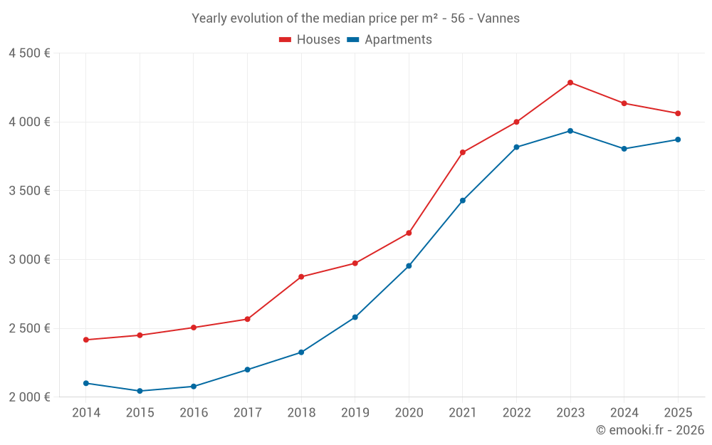 The median price on the 83 house transactions of the last 3 months in the municipality of Vannes was 4 010 € per square meter for a median property value of 451 180 €. Over this period, 60% of transactions were between 3 200 and 5 400 € per square meter (from the 2nd to the 8th deciles).