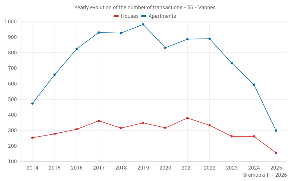 The median price on the 154 apartment transactions of the last 3 months in the municipality of Vannes was 3 826 € per square meter for a median property value of 185 000 €. Over this period, 60% of transactions were between 3 239 and 4 527 € per square meter (from the 2nd to the 8th deciles).