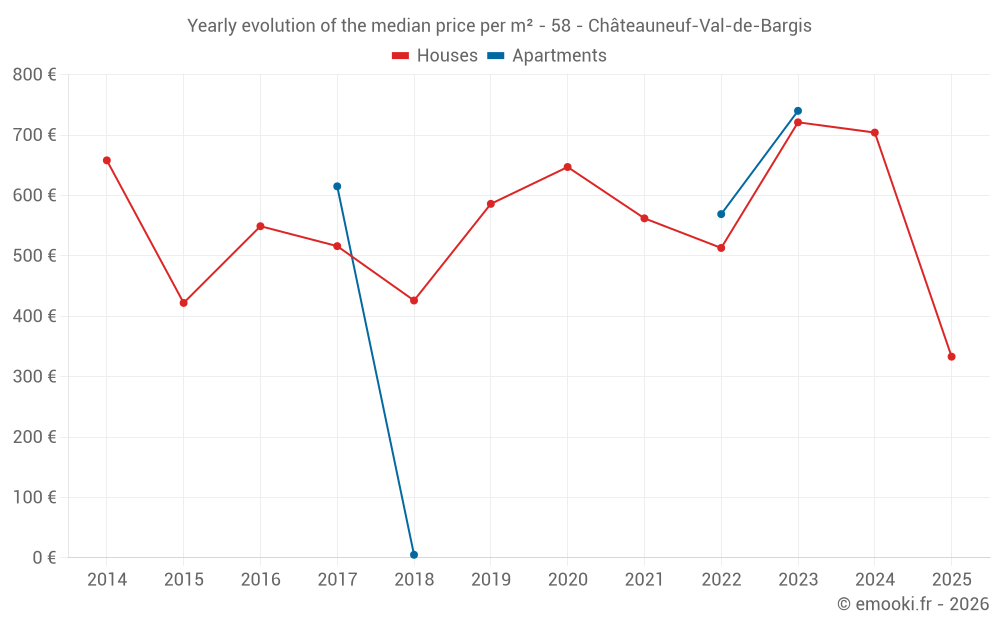 The median price on the 22 house transactions of the last 24 months in the municipality of Châteauneuf-Val-de-Bargis was 704 € per square meter for a median property value of 64 000 €. Over this period, 60% of transactions were between 433 and 1 079 € per square meter (from the 2nd to the 8th deciles).
