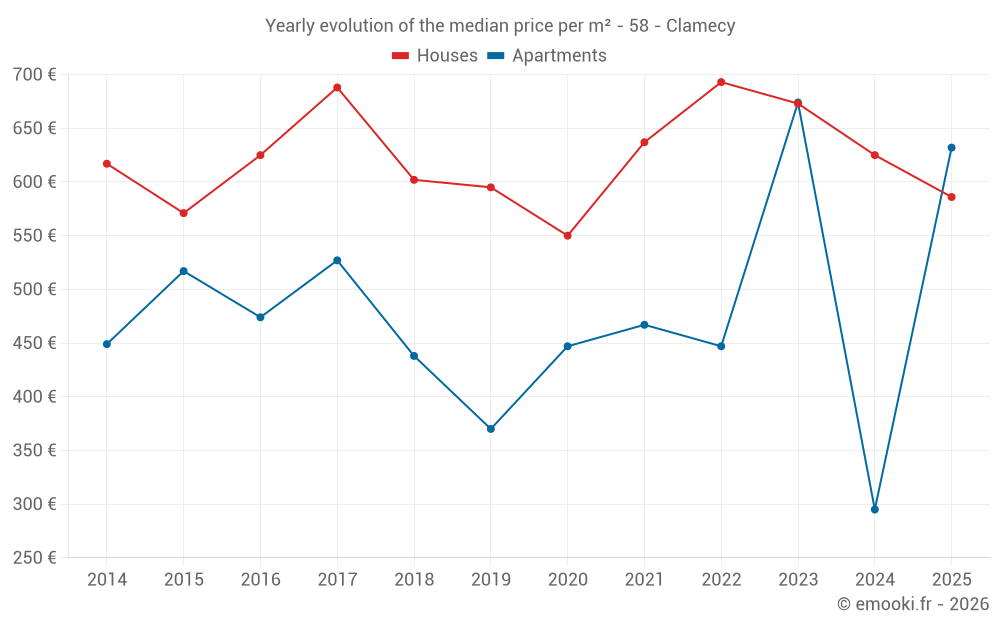 The median price on the 15 apartment transactions of the last 24 months in the municipality of Clamecy was 632 € per square meter for a median property value of 38 000 €. Over this period, 60% of transactions were between 265 and 716 € per square meter (from the 2nd to the 8th deciles).