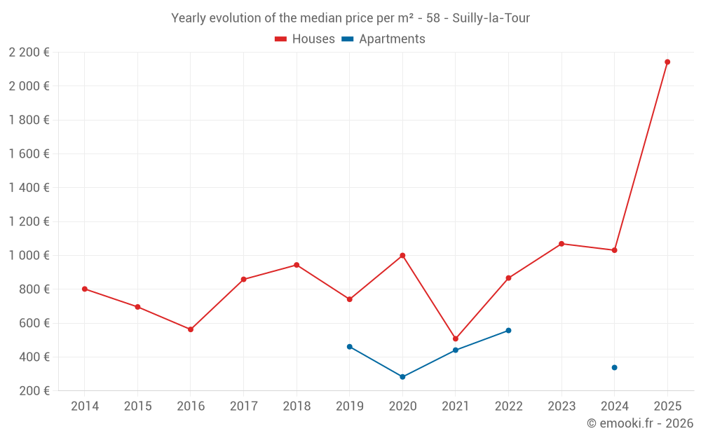 The median price on the 26 house transactions of the last 24 months in the municipality of Suilly-la-Tour was 1 076 € per square meter for a median property value of 91 000 €. Over this period, 60% of transactions were between 758 and 1 507 € per square meter (from the 2nd to the 8th deciles).