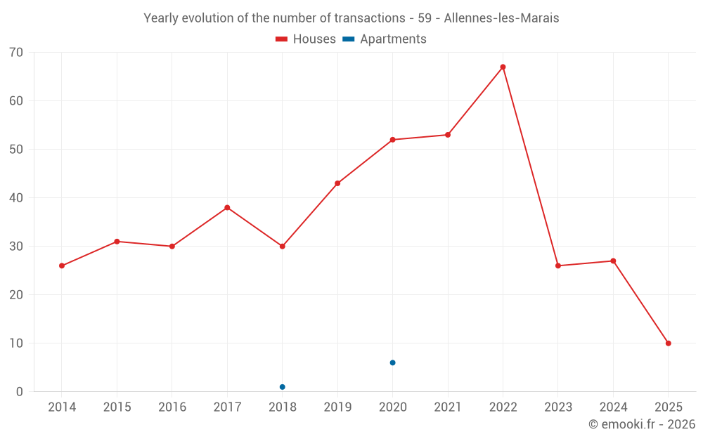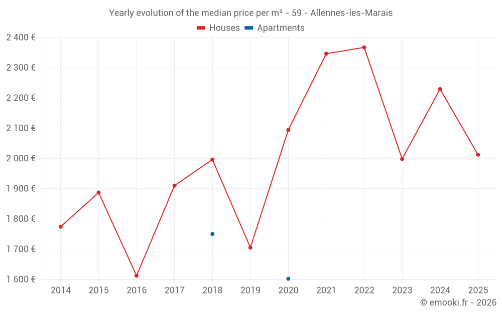 The median price on the 25 house transactions of the last 12 months in the municipality of Allennes-les-Marais was 2 033 € per square meter for a median property value of 200 000 €. Over this period, 60% of transactions were between 1 554 and 2 871 € per square meter (from the 2nd to the 8th deciles).