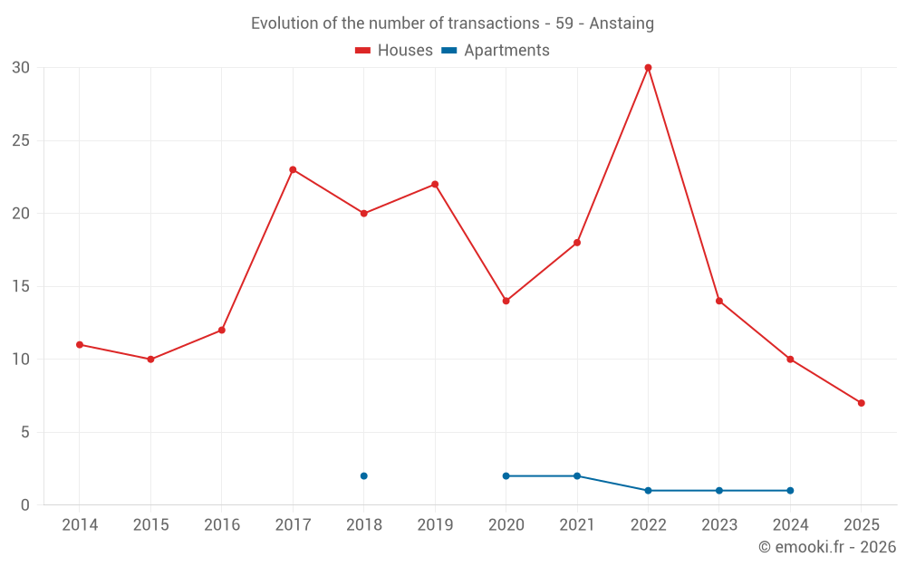 The median price on the 25 house transactions of the last 24 months in the municipality of Anstaing was 2 806 € per square meter for a median property value of 262 000 €. Over this period, 60% of transactions were between 2 408 and 3 893 € per square meter (from the 2nd to the 8th deciles).