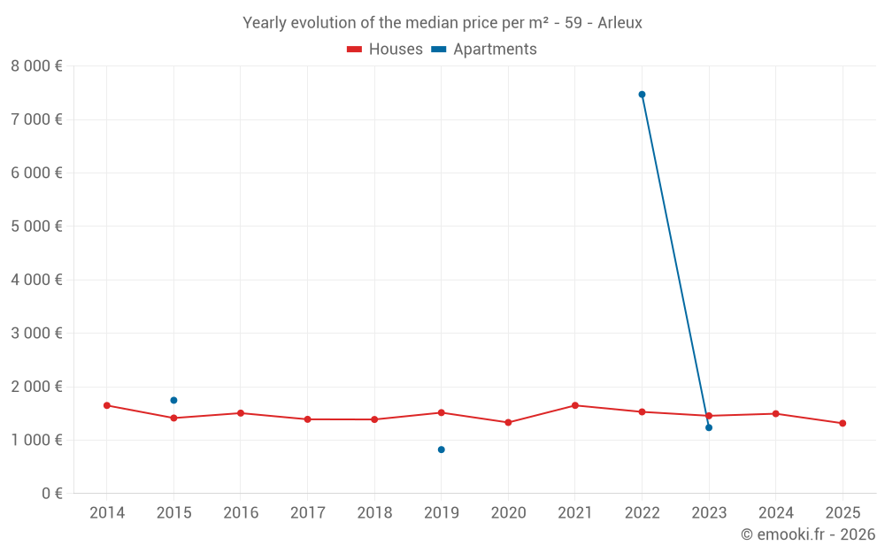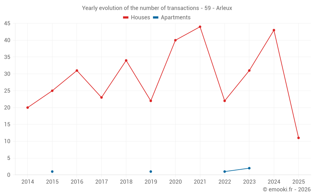 The median price on the 36 house transactions of the last 12 months in the municipality of Arleux was 1 347 € per square meter for a median property value of 122 975 €. Over this period, 60% of transactions were between 980 and 1 714 € per square meter (from the 2nd to the 8th deciles).