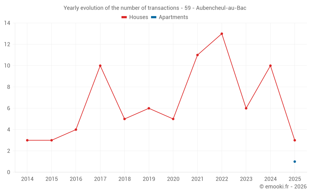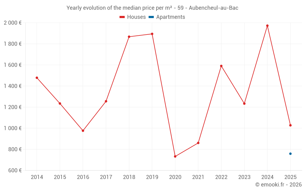 The median price on the 17 house transactions of the last 24 months in the municipality of Aubencheul-au-Bac was 1 858 € per square meter for a median property value of 175 400 €. Over this period, 60% of transactions were between 1 130 and 2 360 € per square meter (from the 2nd to the 8th deciles).