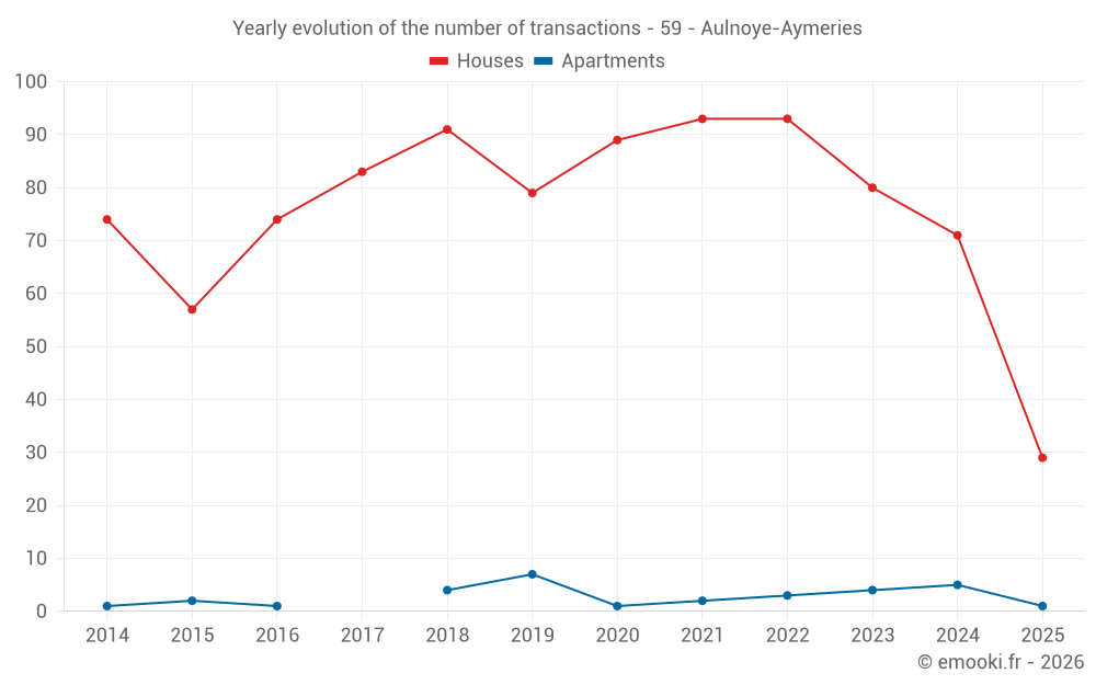 The median price on the 29 house transactions of the last 6 months in the municipality of Aulnoye-Aymeries was 1 279 € per square meter for a median property value of 110 000 €. Over this period, 60% of transactions were between 894 and 1 828 € per square meter (from the 2nd to the 8th deciles).