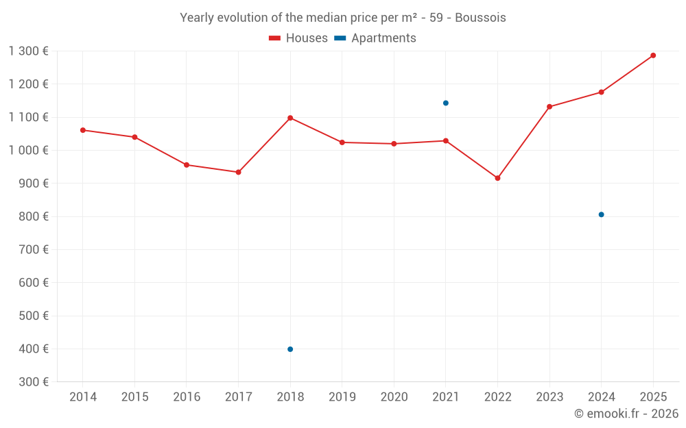 The median price on the 33 house transactions of the last 12 months in the municipality of Boussois was 1 196 € per square meter for a median property value of 110 000 €. Over this period, 60% of transactions were between 916 and 1 594 € per square meter (from the 2nd to the 8th deciles).