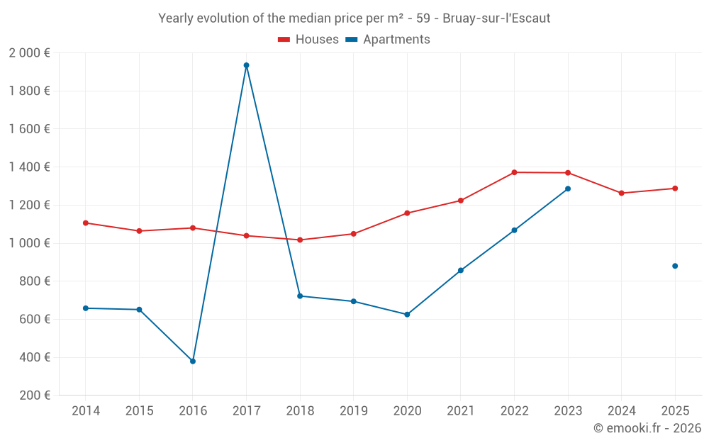 The median price on the 42 house transactions of the last 6 months in the municipality of Bruay-sur-l'Escaut was 1 288 € per square meter for a median property value of 123 400 €. Over this period, 60% of transactions were between 953 and 1 677 € per square meter (from the 2nd to the 8th deciles).
